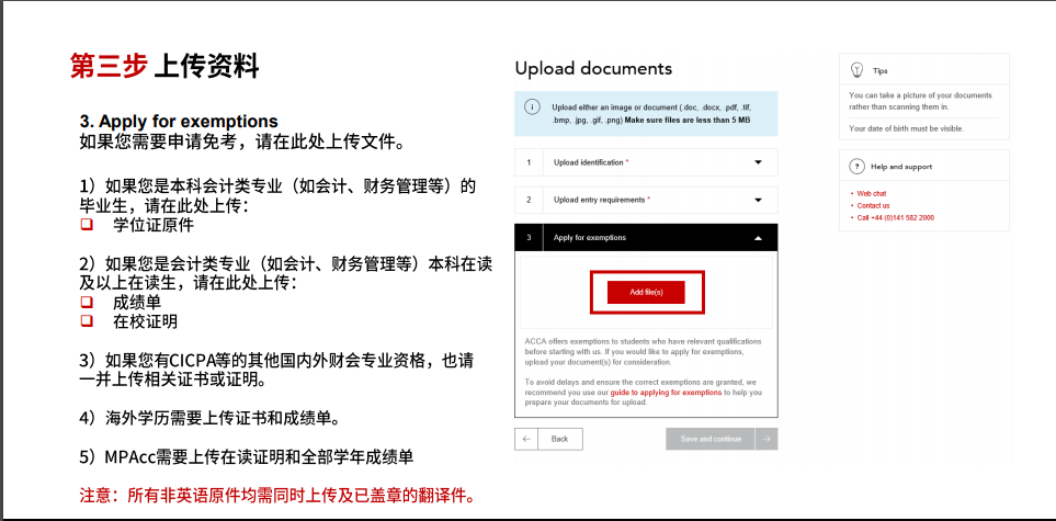 所有文件上傳完畢后,點(diǎn)擊”Save & continue“繼續(xù)下一步。若果在注冊成功后,有新的資格證書復(fù)核免考申請,可以在之后把相關(guān)資格證明發(fā)郵件給ACCA英國總部申請追加免考。