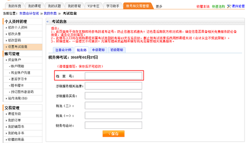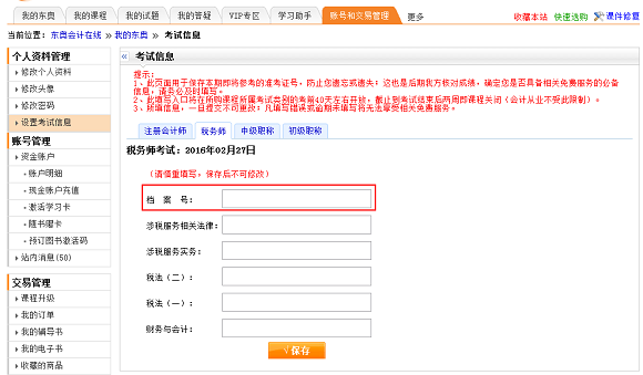 因此東奧會計在線對東奧學員的稅務(wù)師考試信息中檔案號做出如下變更:學員由原來的檔案號變更為準考證號,準考證號成為學員唯一的身份識別號,不再使用檔案號。(具體變更內(nèi)容如圖所示)