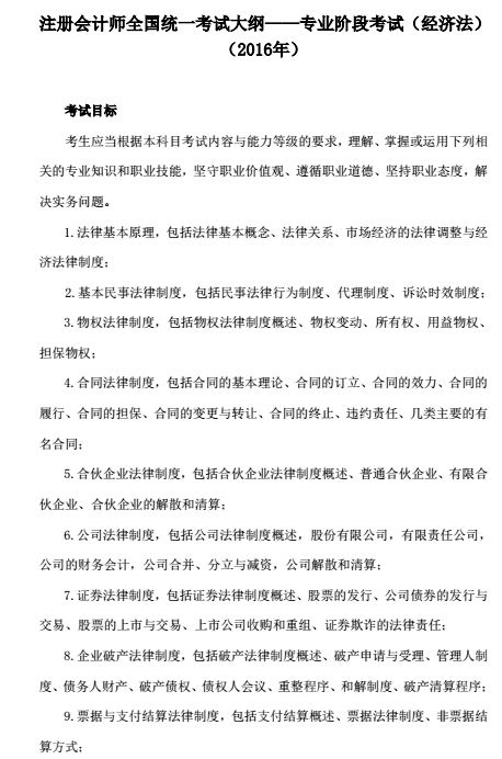 2016年注冊(cè)會(huì)計(jì)師報(bào)名時(shí)間為3月31日至4月29日,東奧會(huì)計(jì)在線將及時(shí)發(fā)布2016年注會(huì)考試報(bào)名相關(guān)信息。2016年注冊(cè)會(huì)計(jì)師全國(guó)統(tǒng)一考試大綱專(zhuān)業(yè)階段和綜合階段已發(fā)布。以下是《經(jīng)濟(jì)法》科目的考試大綱。