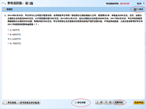 如果在做題過程中遇到難題,暫時得不出答案,可以使用“標記本題”按鈕做標記,等所有題目做完時,通過“試題列表”按鈕,我們可以查看哪些題做了標記,需要重新做,這兩個按鈕替代了以為筆試時考生在試卷上做標記,并且更方便我們查找標記題,也避免在做題過程中有漏題的現(xiàn)象發(fā)生。