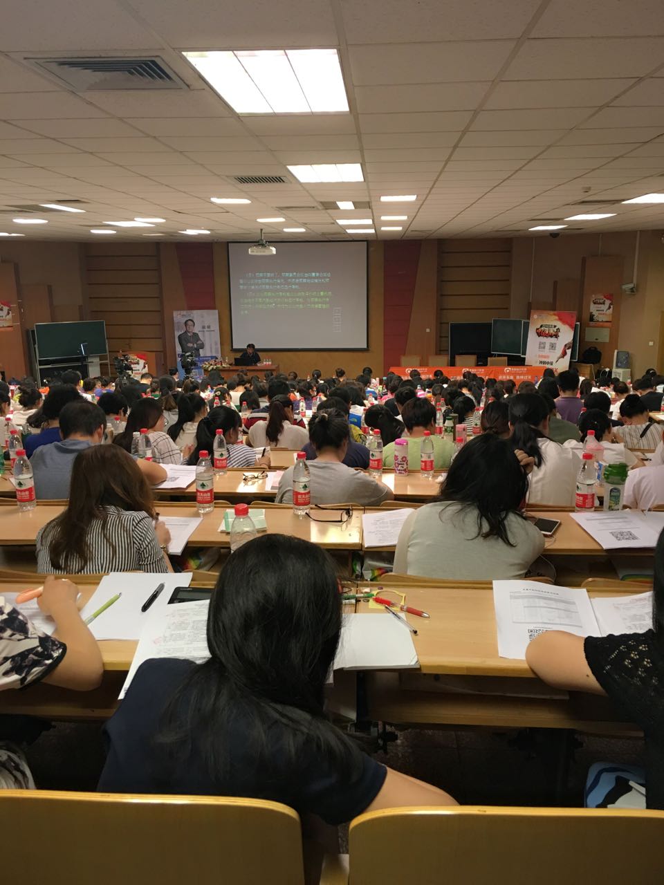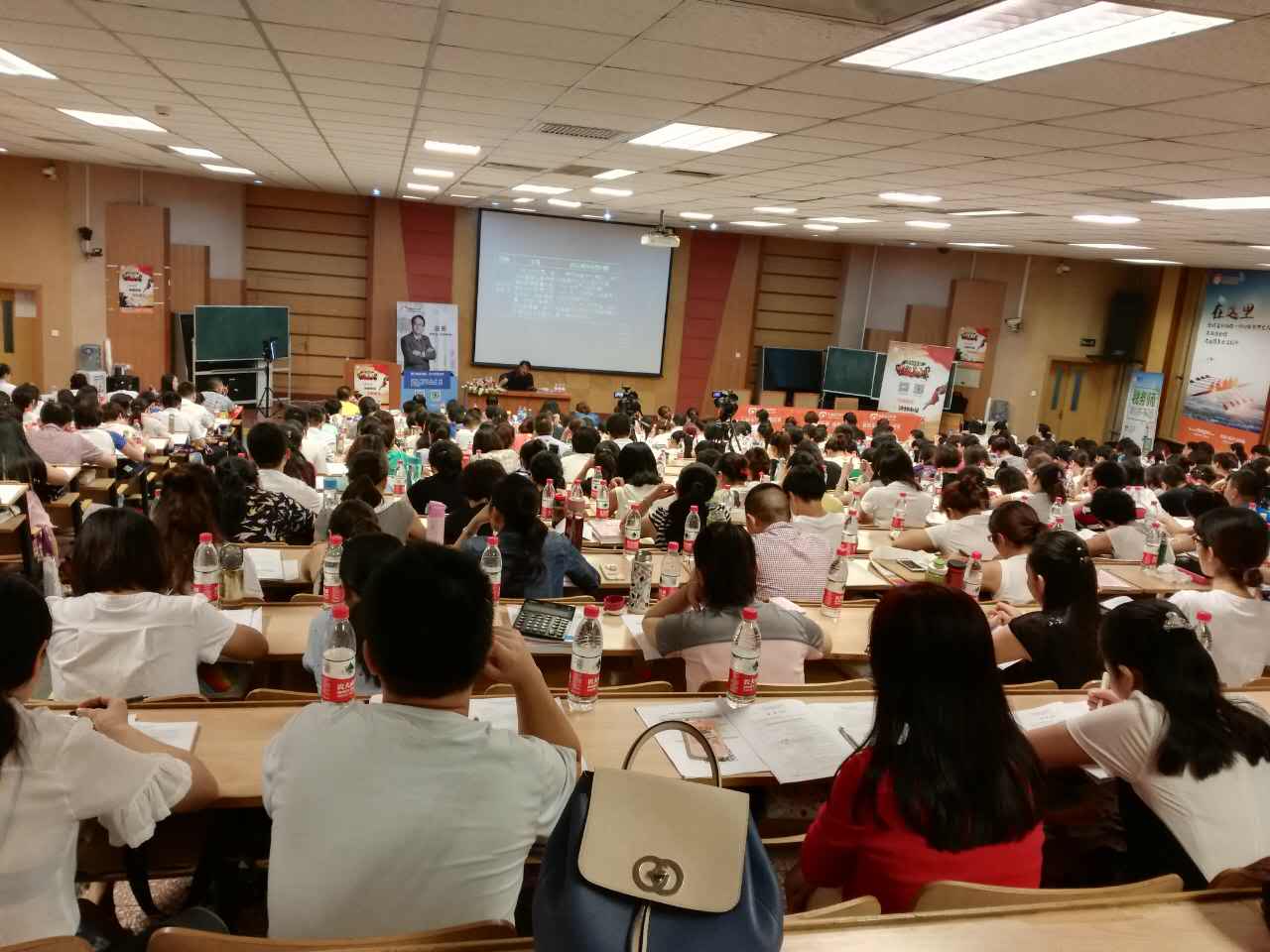 寬敞的大廳擠滿了前來(lái)聽(tīng)課的同學(xué)。臺(tái)上的老師,和臺(tái)下的同學(xué),