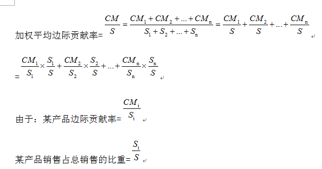 加權(quán)平均邊際貢獻(xiàn)率也可以用另外的方法計(jì)算。設(shè)有n種產(chǎn)品,以CM表示邊際貢獻(xiàn),S表示銷售收入,則: