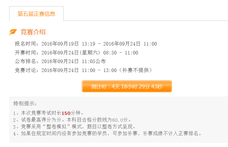 正賽:正式公布考試時間后,大家可以進(jìn)行考試報名,待考試開始后方可進(jìn)入考試,考試期間內(nèi)可隨時交卷,考試結(jié)束后仍未交卷的同學(xué),系統(tǒng)進(jìn)行統(tǒng)一交卷,考試結(jié)束5分鐘后可查看個人排名,2小時內(nèi)大家可以進(jìn)行討論交流。