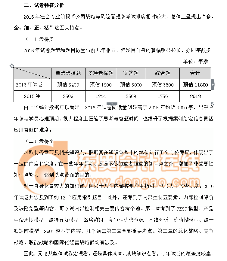 2016年注會專業(yè)階段《公司戰(zhàn)略與風(fēng)險管理》考試總的來說難度不小,一改近三年來的出題風(fēng)格,是開啟今后一段時期新的考查風(fēng)格的具有里程碑標(biāo)志意義的試卷,有很強(qiáng)的現(xiàn)實借鑒意義。作為2017年該科復(fù)習(xí)備考系列文章之一,下面對2016年《公司戰(zhàn)略與風(fēng)險管理》試卷進(jìn)行詳細(xì)解讀。
