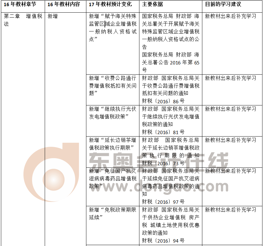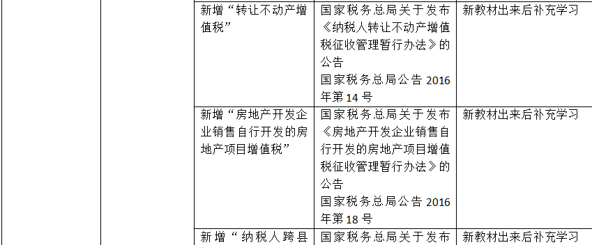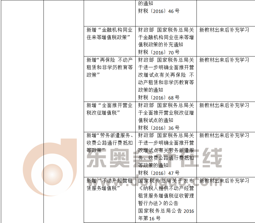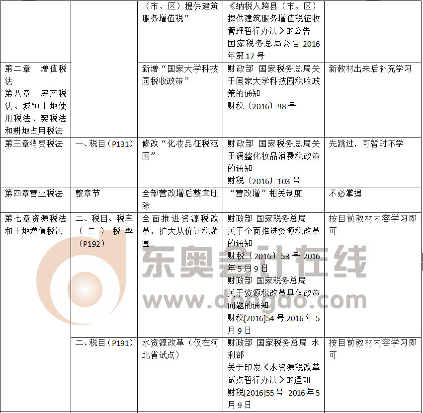 “營改增”是2017年稅法備考的主旋律,在預(yù)習(xí)階段應(yīng)該有針對性的學(xué)習(xí)財稅〔2016〕36號文件中的相關(guān)知識,營改增的調(diào)整不僅僅涉及到營業(yè)稅的取消和增值稅征稅范圍的擴(kuò)大,也會影響其他稅種的計算,比如土地增值稅、房產(chǎn)稅、企業(yè)所得稅、個稅所得稅等。所以現(xiàn)階段預(yù)習(xí)2017年的稅法內(nèi)容,遇到相關(guān)營業(yè)稅的內(nèi)容要考慮“營改增”后,相關(guān)的處理方式有什么調(diào)整。可以參考2016年稅務(wù)師相關(guān)教材和輔導(dǎo)資料學(xué)習(xí)這部分內(nèi)容。除了“營改增”之外,資源稅從價改革的范圍進(jìn)一步擴(kuò)大,相信此項調(diào)整也會體現(xiàn)在2017年的注會輔導(dǎo)教材之上。