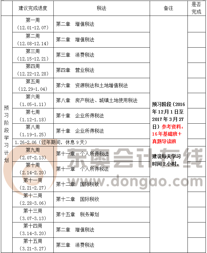 2017年注冊會計師考試綜合階段考試科目為:《職業(yè)能力綜合測試(試卷一)》、《職業(yè)能力綜合測試(試卷二)》,為幫助同學們順利完成今年的注冊會計師綜合階段學習,東奧制定了這份學習計劃表,以方便同學們對綜合階段預習進度進行全面控制,達到較好的學習效果。希望大家根據(jù)自己的情況,有計劃的去復習,逐步實現(xiàn)自己的目標。