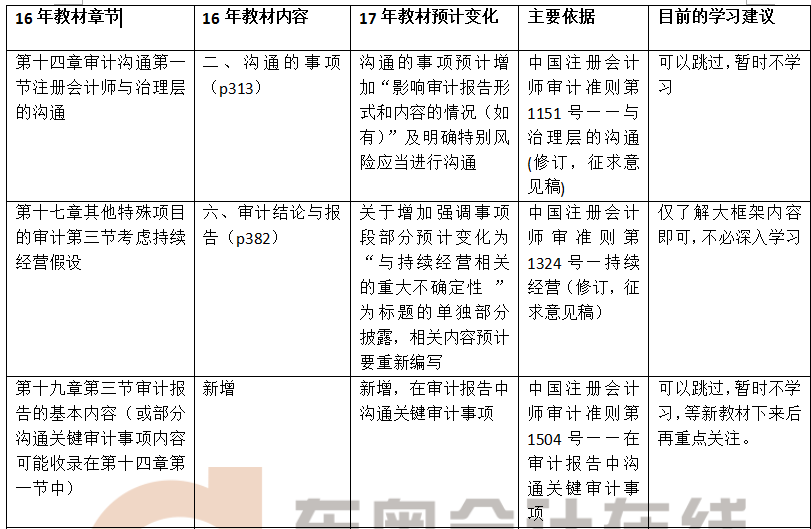 2017年注會考試備考已經(jīng)開始了,在教材未發(fā)布前也許大家是迷茫的,2017年注冊會計師考試教材變動到底大不大?在教材還沒公布前學習2016年的課程是否可行?很多人在猶豫、徘徊中,時間就這么過去了,為了幫忙大家順利進入學習狀態(tài),了解2017年注冊會計師考試《審計》教材變化情況,東奧老師給出了預測,抓緊時間開始備戰(zhàn)吧!