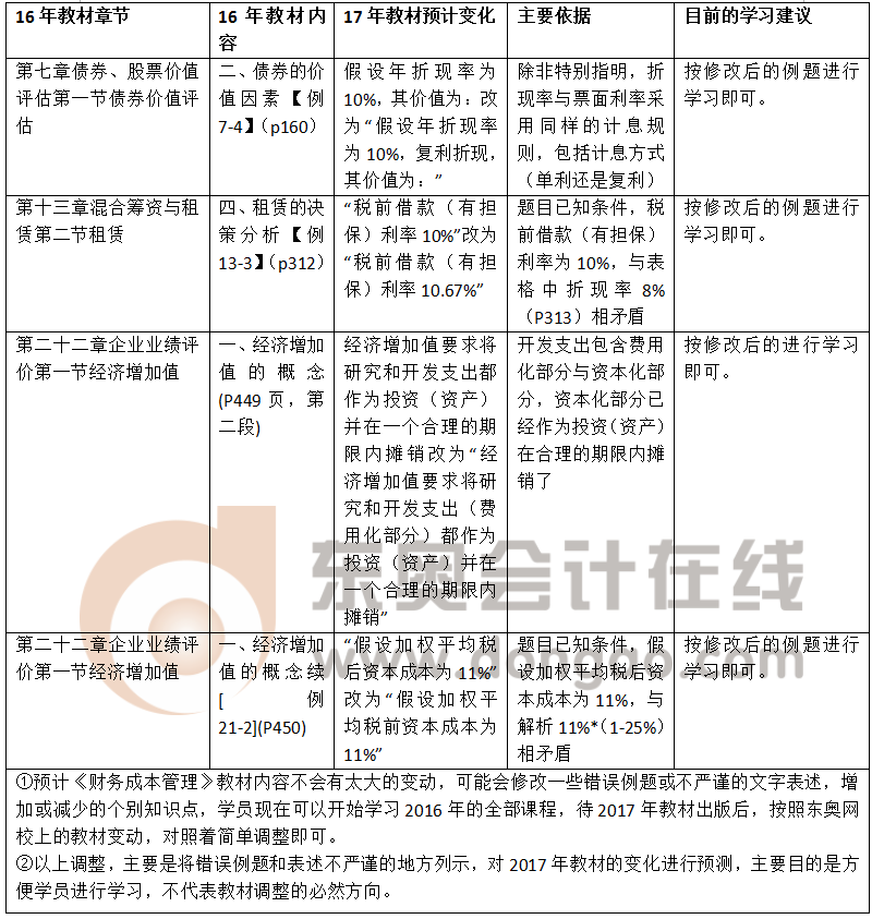 2017年注會考試備考已經(jīng)開始了,在教材未發(fā)布前也許大家是迷茫的,2017年注冊會計師考試教材變動到底大不大?在教材還沒公布前學(xué)習(xí)2016年的課程是否可行?很多人在猶豫、徘徊中,時間就這么過去了,為了幫忙大家順利進入學(xué)習(xí)狀態(tài),了解2017年注冊會計師考試《財管》教材變化情況,東奧老師給出了預(yù)測,抓緊時間開始備戰(zhàn)吧!