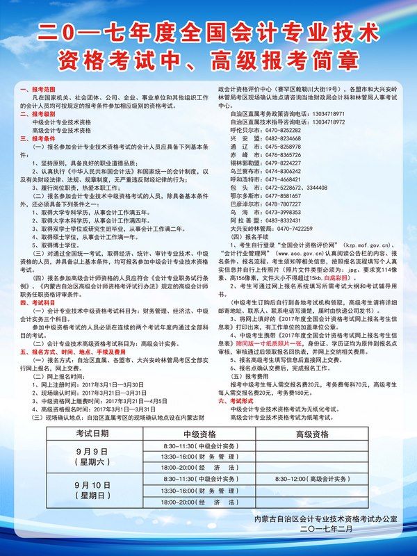 內(nèi)蒙古2017年中級(jí)會(huì)計(jì)職稱考試網(wǎng)上注冊(cè)時(shí)間為3月1日-3月30日,現(xiàn)場(chǎng)確認(rèn)時(shí)間為3月21日-3月31日(節(jié)假日除外),網(wǎng)上繳費(fèi)時(shí)間為3月21日-4月5日,每人報(bào)名費(fèi)20元、考務(wù)費(fèi)每科70元。中級(jí)會(huì)計(jì)考試于9月9日-10日舉行,共分兩個(gè)批次。