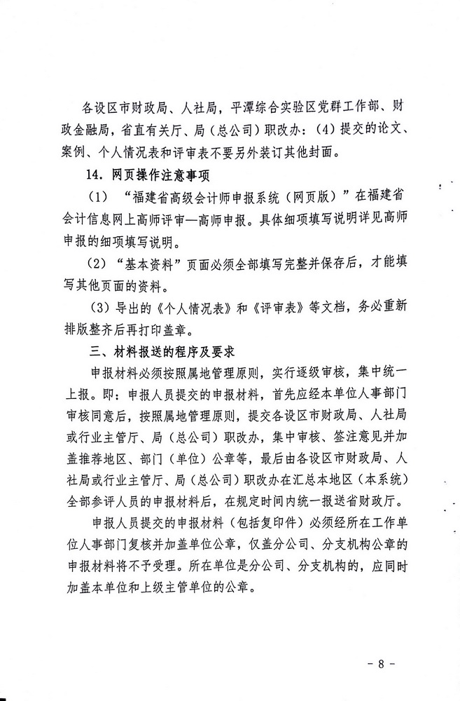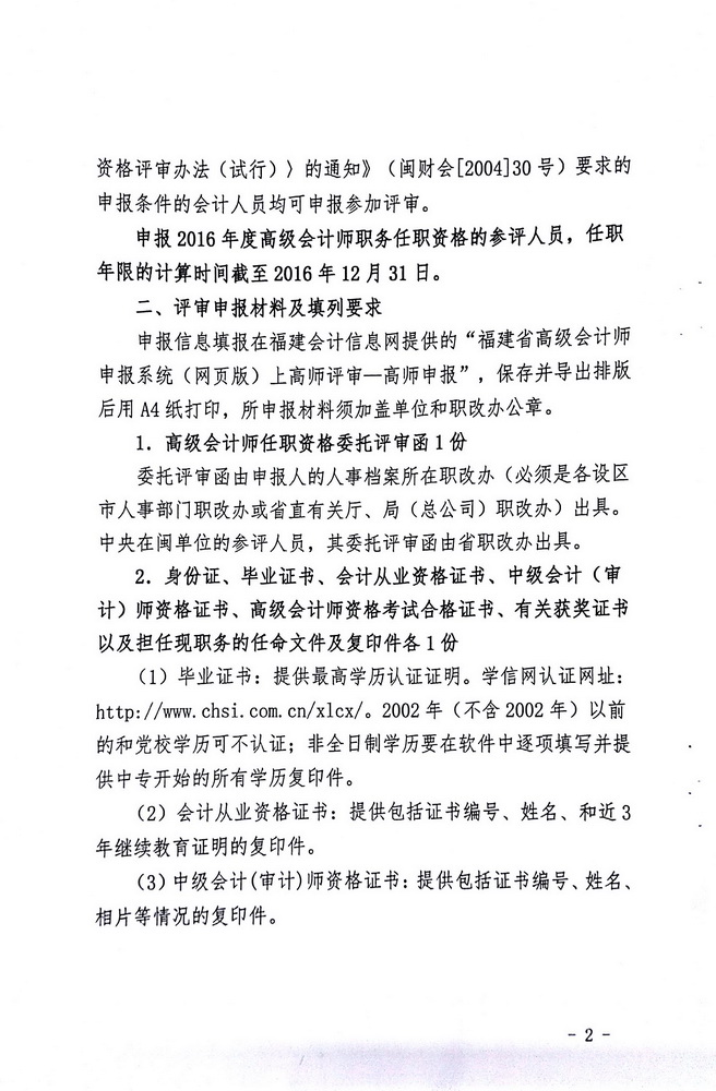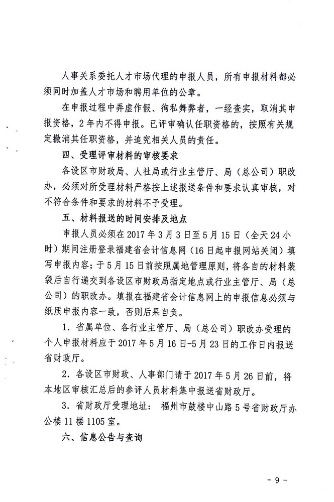 東奧會計在線高級會計師頻道提供:福建報送2016高級會計師評審材料時間出爐,申報人員必須在2017年3月3日至5月15日(全天24小時)期間注冊登錄福建省會計信息網(wǎng)填寫申報內(nèi)容(16日起申報網(wǎng)站關(guān)閉);于5月15日前按照屬地管理原則,將各自的材料裝袋后自行遞交到各設(shè)區(qū)市財政局指定地點(diǎn)或行業(yè)主管廳、局(總公司)的職改辦。填報在福建省會計信息網(wǎng)上的申報信息必須與紙質(zhì)申報內(nèi)容一致,否則后果自負(fù)。