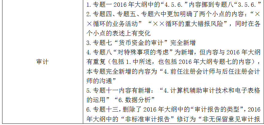 2017年注冊會計師綜合階段考試大綱主要是以“調(diào)整結(jié)構(gòu)”、“新增專題”為主調(diào),其中會計部分章節(jié)進行重新整合,同時新增6個專題;審計新增兩個專題;稅法新增一個專題;財管部分進行了較大的結(jié)構(gòu)性調(diào)整,部分專題進行了合并和拆分,部分專題的名稱進行了調(diào)整,新增的2個專題;戰(zhàn)略和經(jīng)濟法各新增1個專題,具體內(nèi)容如下: