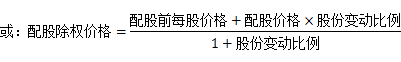 配股除權(quán)價(jià)格計(jì)算 | 通常配股股權(quán)登記日后要對(duì)股票進(jìn)行除權(quán)處理。除權(quán)后股票的理論除權(quán)基準(zhǔn)價(jià)格為: 【重要提示】(1)當(dāng)所有股東都參與配股時(shí),此時(shí)股份變動(dòng)比例(也即實(shí)際配售比例)等于擬配售比例。(2)除權(quán)價(jià)只是作為計(jì)算除權(quán)日股價(jià)漲跌幅度的基準(zhǔn),提供的只是一個(gè)基準(zhǔn)參考價(jià)。如果除權(quán)后股票交易市價(jià)高于該除權(quán)基準(zhǔn)價(jià)格,這種情形使得參與配股的股東財(cái)富較配股前有所增加,稱為“填權(quán)”;反之股價(jià)低于除權(quán)基準(zhǔn)價(jià)格則會(huì)減少參與配股股東的財(cái)富,稱為“貼權(quán)”。 |