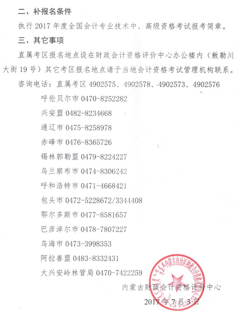 【東奧會計在線——中級會計職稱頻道提供】內(nèi)蒙古2017年中級會計職稱補(bǔ)報名通知已公布,補(bǔ)報名時間:7月6日網(wǎng)上注冊,7月7日現(xiàn)場審核。