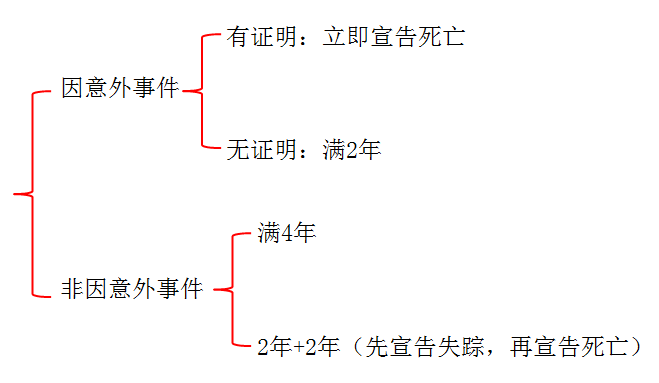 (1)自然人下落不明滿4年或因意外事件、下落不明滿2年(因意外事件下落不明,經(jīng)有關(guān)機關(guān)證明該自然人不可能生存的,申請宣告死亡不受2年時間的限制)的,利害關(guān)系人可以向人民法院申請宣告該自然人死亡。