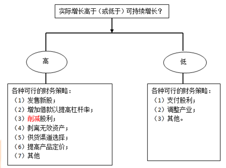 從管理角度,由于企業(yè)增長(zhǎng)受限于可持續(xù)增長(zhǎng)率,因此當(dāng)企業(yè)實(shí)際增長(zhǎng)率超過可持續(xù)增長(zhǎng)率時(shí),將面臨資本需要和融資壓力;而當(dāng)企業(yè)實(shí)際增長(zhǎng)低于可持續(xù)增長(zhǎng)時(shí),表明市場(chǎng)萎縮,企業(yè)應(yīng)調(diào)整自身經(jīng)營戰(zhàn)略。下圖列出了各種不同情形下的融資規(guī)劃與財(cái)務(wù)管理策略,它為公司增長(zhǎng)管理提供了一個(gè)可行的框架。