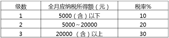 第一級的5000元適用10%的稅率,應(yīng)納稅額為5000×10%=500(元);