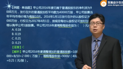 【解析】本題考查的是知識點稀釋每股收益的計算。調(diào)整增加的普通股股數(shù)=300-300×5.2/6=40(萬股),稀釋每股收益=800/(2000+40)=0.39(元),所以選項C正確。參考教材P124。