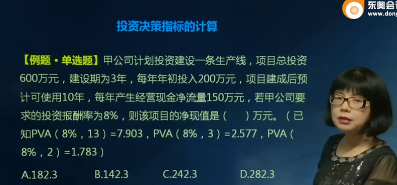 【解析】本題考查的知識點是凈現(xiàn)值法的計算。該項目的凈現(xiàn)值=-900+250×[(P/A,9%,13)-(P/A,9%,3)]=-900+250×(7.4869-2.5313)=338.9(萬元),所以選項B正確。參考教材P74。