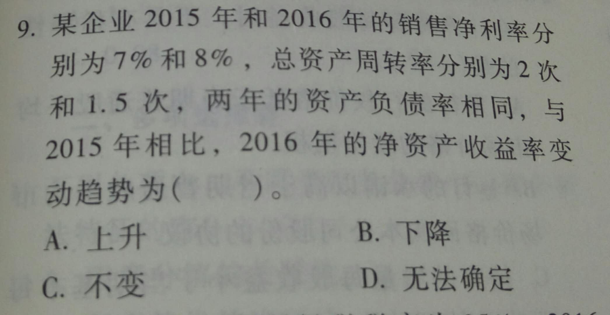 7.甲公司2015年和2016年的銷售凈利率分別為10%和12%,總資產(chǎn)周轉(zhuǎn)率分別為6和5,假定資產(chǎn)負(fù)債率保持不變。則與2015年相比,甲公司2016年凈資產(chǎn)收益率變動趨勢為( )。