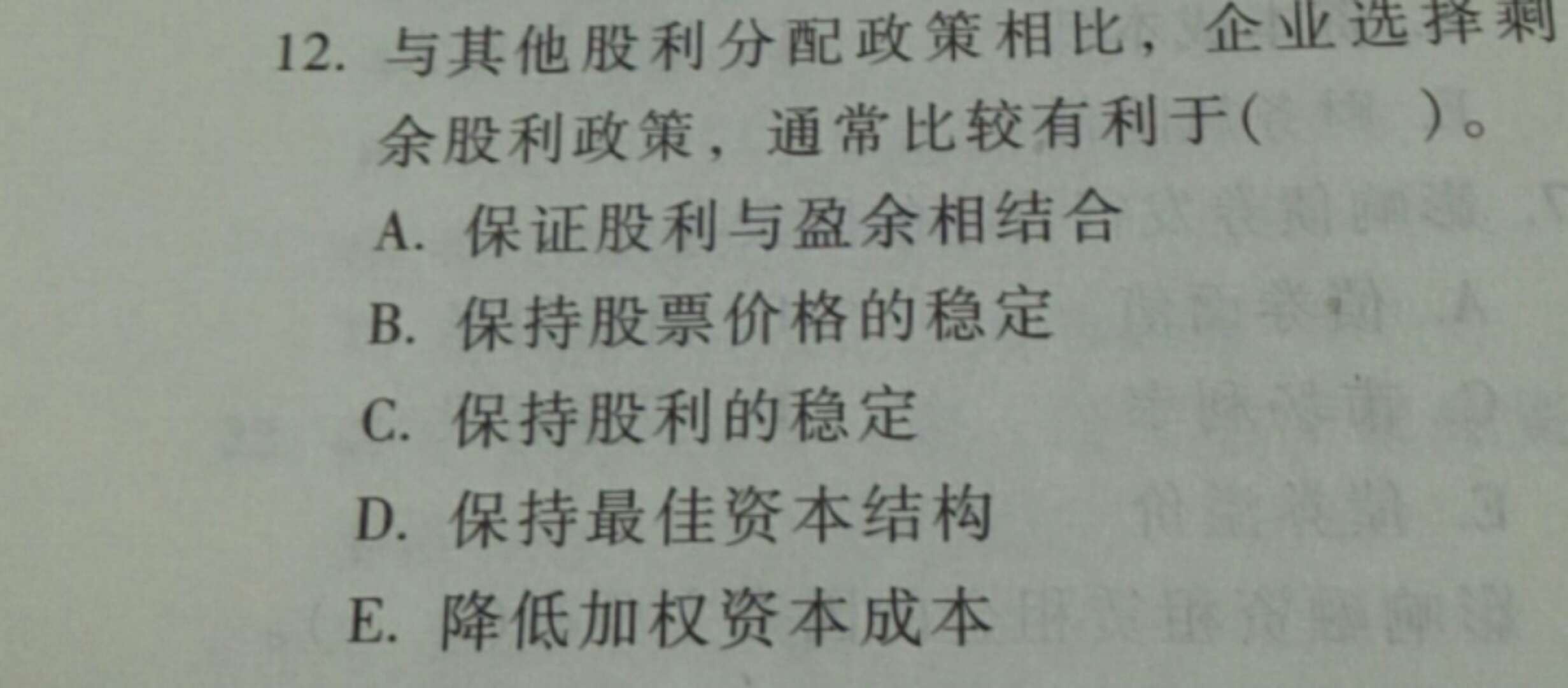 11.下列各項股利分配政策中,有利于企業(yè)保持理想的資本結(jié)構(gòu)、使綜合資本成本降至最低的是( )。