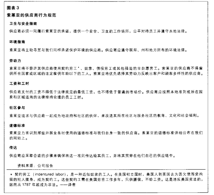 羅森博格通過一年的計劃設(shè)計出一個雄心勃勃的戰(zhàn)略:索萊亞北美分部不能僅向那些感興趣并愿意額外支付高價的客戶提供具有可持續(xù)性的產(chǎn)品,更應(yīng)通過提供有關(guān)可持續(xù)問題的專家建議,和整個市場共享各項創(chuàng)新。使可持續(xù)變?yōu)檎7?wù)的組成部分;衡量客戶的績效改進;積極地與各個區(qū)域的利益相關(guān)者團體、非政府組織(NGO)和貿(mào)易聯(lián)盟合作,優(yōu)先考慮他們的各項持續(xù)性問題。羅森博格告訴利益相關(guān)者群體,“我們希望通過提供以可持續(xù)性為導(dǎo)向的各項實踐和服務(wù),增強與客戶的關(guān)系,因為他們可看到選用可持續(xù)性的做法能帶來積極的成長。他們的成功就是我們的成功?!?/span>