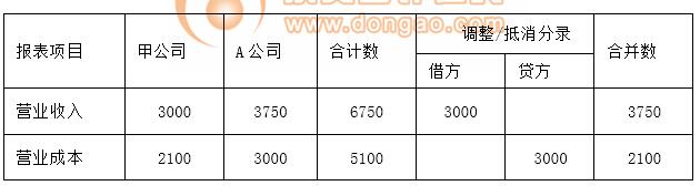 【例題】甲公司擁有A公司70%的股權(quán),系A(chǔ)公司的母公司。甲公司本期個別利潤表的營業(yè)收入中有3000萬元,系向A公司銷售產(chǎn)品取得的銷售收入,該產(chǎn)品銷售成本為2100萬元。A公司在本期將該產(chǎn)品全部售出,其銷售收入為3750萬元,銷售成本為3000萬元,并分別在其個別利潤表中列示。