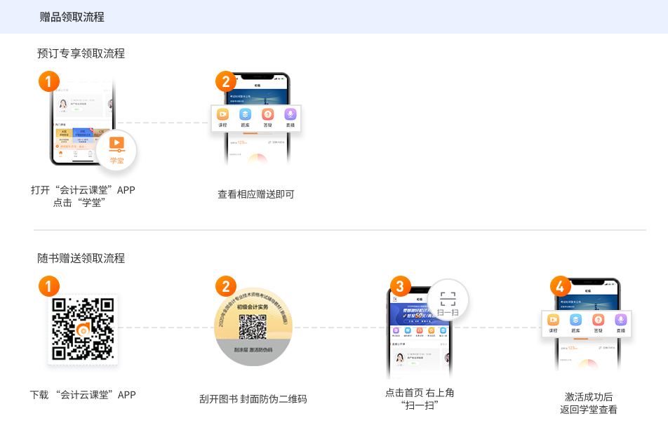 配套練習(xí)題庫 | 【隨書贈(zèng)送】本書試題支持APP在線同步做題,您可以在APP“題庫”專區(qū)相應(yīng)模塊做題。 | 登錄”會(huì)計(jì)云課堂app“,點(diǎn)擊“我的”—“圖書激活”,掃描防偽標(biāo)簽碼激活后,返回學(xué)堂查看即可。 | |