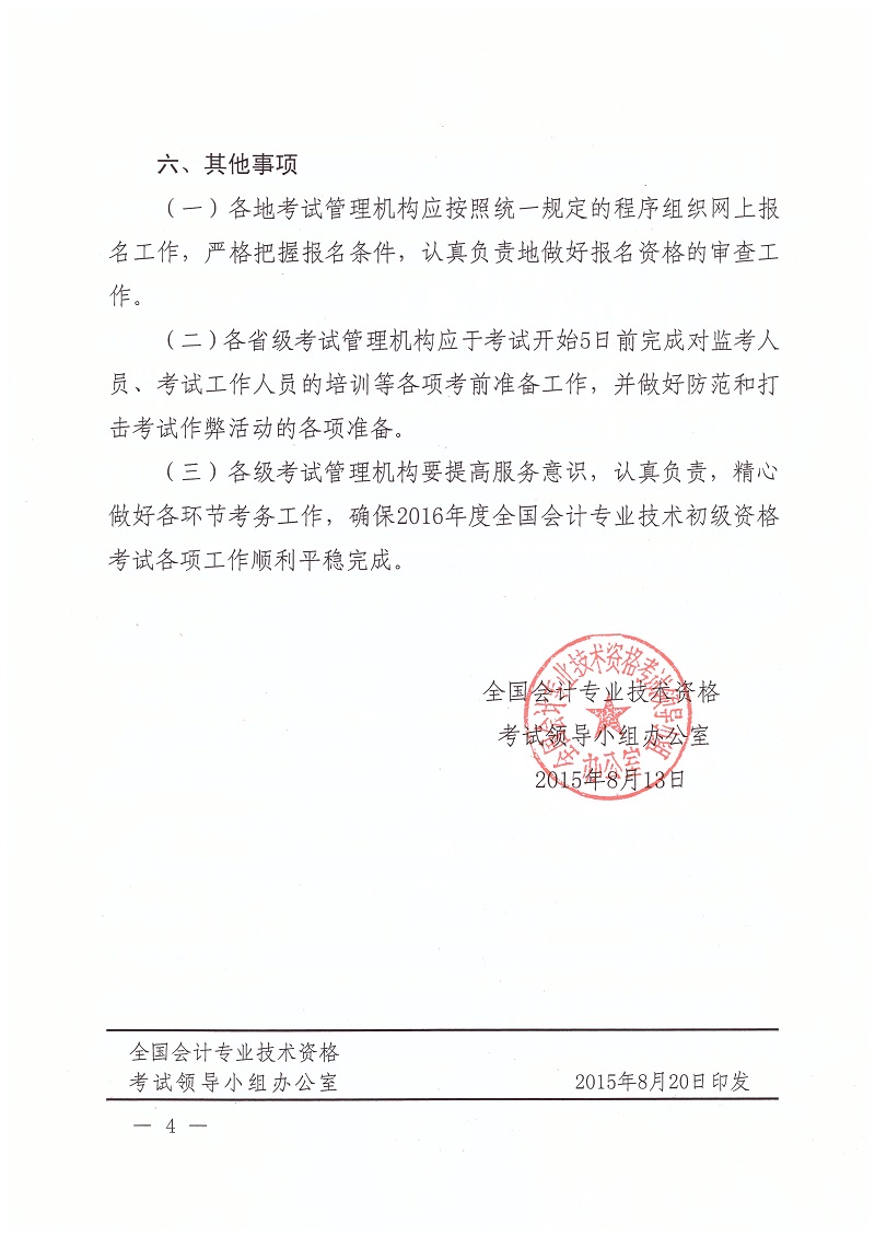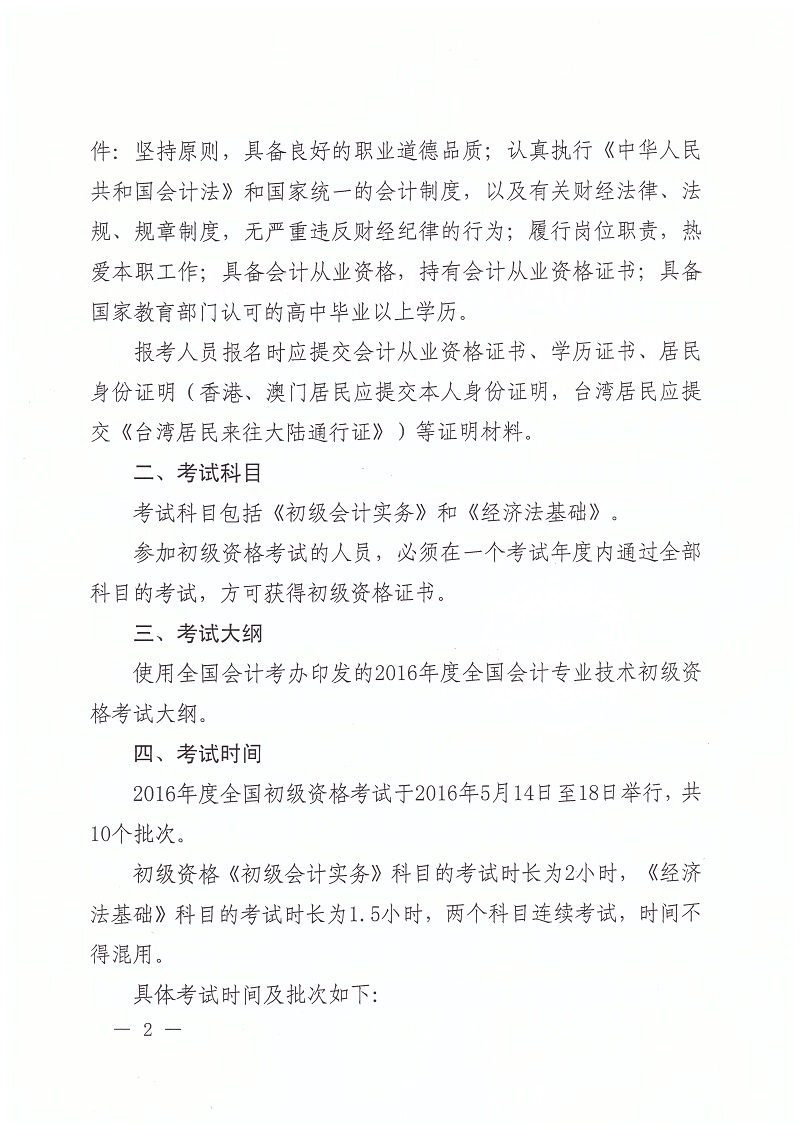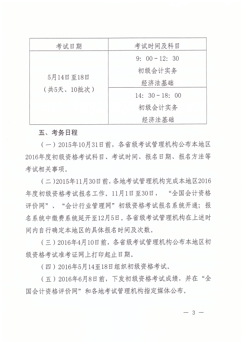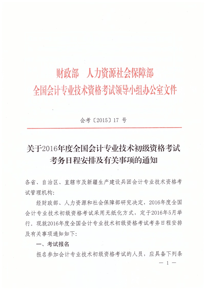 關(guān)于2016年度全國會計專業(yè)技術(shù)初級資格考試考務日程安排及有關(guān)事項的通知