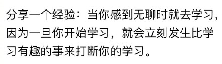 雖然起初這個話題的興起是一種玩笑的心態(tài),因為有人發(fā)現(xiàn),當(dāng)你感到無聊時,就去學(xué)習(xí),因為一旦開始學(xué)習(xí),就會立刻發(fā)生比學(xué)習(xí)有趣的事來打斷你的學(xué)習(xí)。