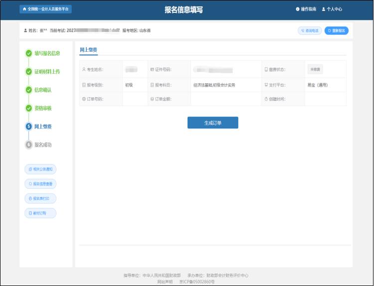等待審核通過后,重新選擇考試會(huì)直接進(jìn)入到網(wǎng)上繳費(fèi)的頁面。頁面展示考生報(bào)名基本信息、訂單基本信息、支付平臺(tái)以及繳費(fèi)狀態(tài)信息。如下圖所示: