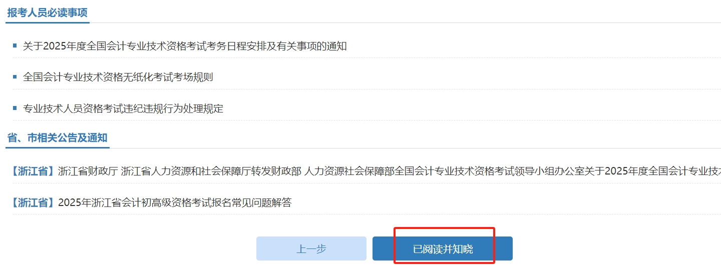 完成閱讀須知后,進(jìn)入到所選擇省份設(shè)置的通知公告頁面,包括報(bào)考人員必讀事項(xiàng)以及省、市相關(guān)公告及通知。點(diǎn)擊“已閱讀并知曉”,如下圖所示: