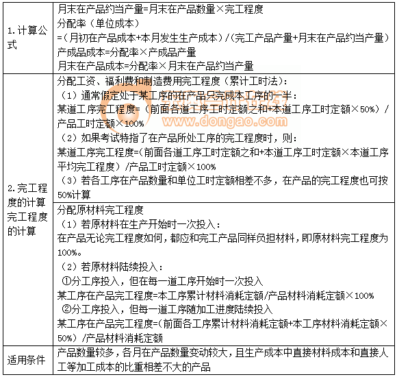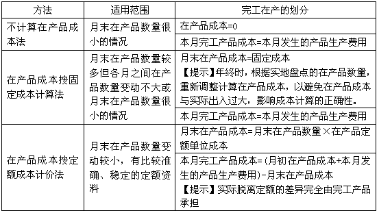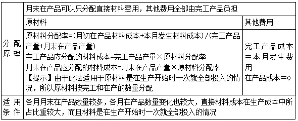 【提示】公式前兩項之和為待分配費用,待分配費用在完工產(chǎn)品與月末在產(chǎn)品之間分配有兩類方法:一是“倒擠法”,即先確定月末在產(chǎn)品成本,再用待分配費用減月末在產(chǎn)品成本得出完工產(chǎn)品的成本;二是“分配法”,即將待分配費用按一定比例在完工產(chǎn)品與月末在產(chǎn)品之間進(jìn)行分配。