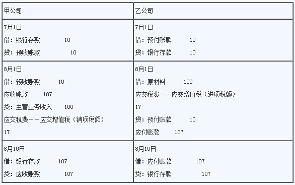 甲公司和乙公司均為一般納稅企業(yè),適用的增值稅率為17%。2011年7月1日甲公司與乙公司簽訂購銷合同,甲公司向乙公司銷售商品,價款100萬元,增值稅17萬元,合同規(guī)定簽訂合同當日乙公司預(yù)付價款的10%,剩余款項在交貨時付清。甲公司收到預(yù)收款項。2011年8月1日,甲公司發(fā)出商品并開出增值稅專用發(fā)票,價款100萬元,增值稅17萬元。乙公司收到存貨作為原材料核算。8月10日差額通過銀行存款結(jié)清。