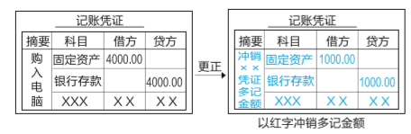更正方法:②記賬憑證與賬簿記錄科目無誤,金額多記的,如下圖所示更正記賬憑證,并據以用紅字登記入賬。
