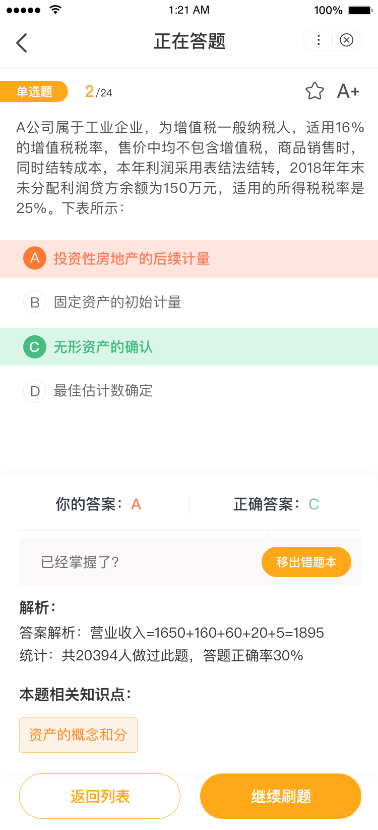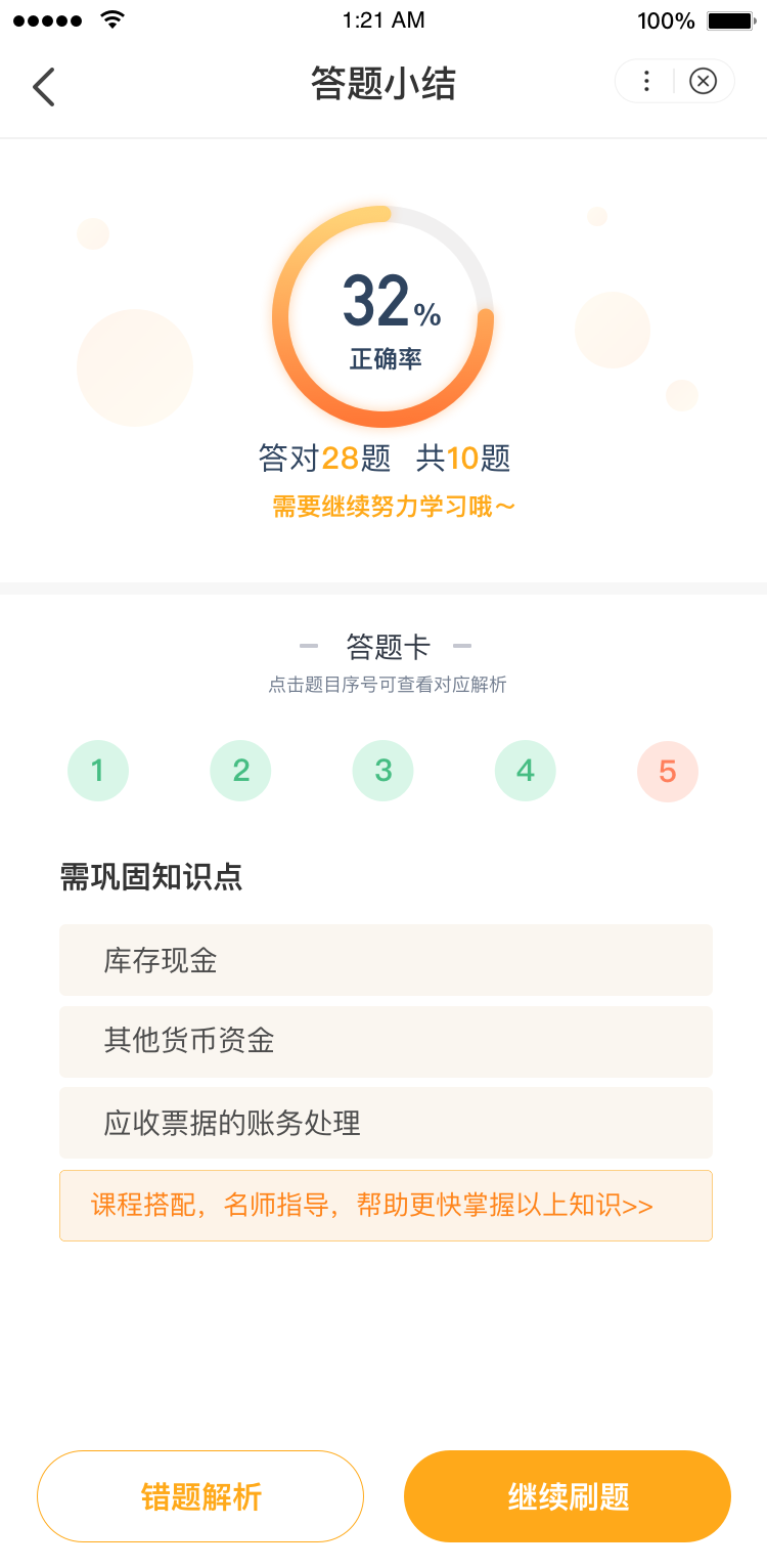 進(jìn)入答題頁(yè)面后,大家根據(jù)題型選擇正確答案即可,如果出現(xiàn)錯(cuò)題,程序會(huì)給出大家答案解析以及相關(guān)知識(shí)點(diǎn),幫助大家更好的掌握錯(cuò)題原因,避免下次錯(cuò)誤。