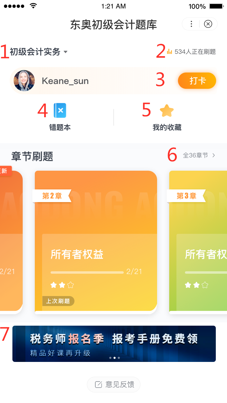 題庫(kù)首頁(yè) | 功能介紹 1.科目切換:點(diǎn)擊按鈕即可切換初級(jí)會(huì)計(jì)考試科目,包括《初級(jí)會(huì)計(jì)實(shí)務(wù)》和《經(jīng)濟(jì)法基礎(chǔ)》。 2.刷題人數(shù):實(shí)時(shí)展示在線刷題人數(shù),你不是一人在奮斗! 3.打卡日歷:幫助大家堅(jiān)持打卡做題,隨著打卡天數(shù)大家還會(huì)有不同等級(jí)的標(biāo)識(shí),打卡天數(shù)越多,等級(jí)越高哦。 4.錯(cuò)題本:在做題過(guò)程中可以將錯(cuò)題放入錯(cuò)題本中,方便在以后的學(xué)習(xí)中隨時(shí)復(fù)習(xí)。 5.我的收藏:在做題的過(guò)程中遇到好題、難題、經(jīng)典題可以將其放在我的收藏中,以便在以后的學(xué)習(xí)中隨時(shí)復(fù)習(xí)。 6.章節(jié)刷題:點(diǎn)擊右側(cè)按鈕,進(jìn)入章節(jié)刷題頁(yè)面,點(diǎn)擊對(duì)應(yīng)的章節(jié)進(jìn)行學(xué)習(xí)即可。 7.實(shí)時(shí)資訊:幫助考生及時(shí)了解最近考試動(dòng)態(tài)、課程信息等內(nèi)容。 |