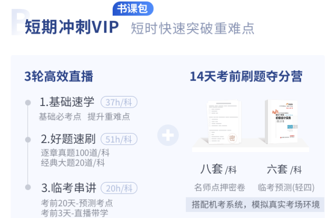 一站式通關書課包涵蓋A 輕一豪華書課包+B 短期沖刺VIP班+AI導師系統(tǒng)。除此之外還可免費享《輕松過關?一》、《輕松過關?二》、《輕松過關?三》、《輕松過關?四》。最全書課組合,一站全享!