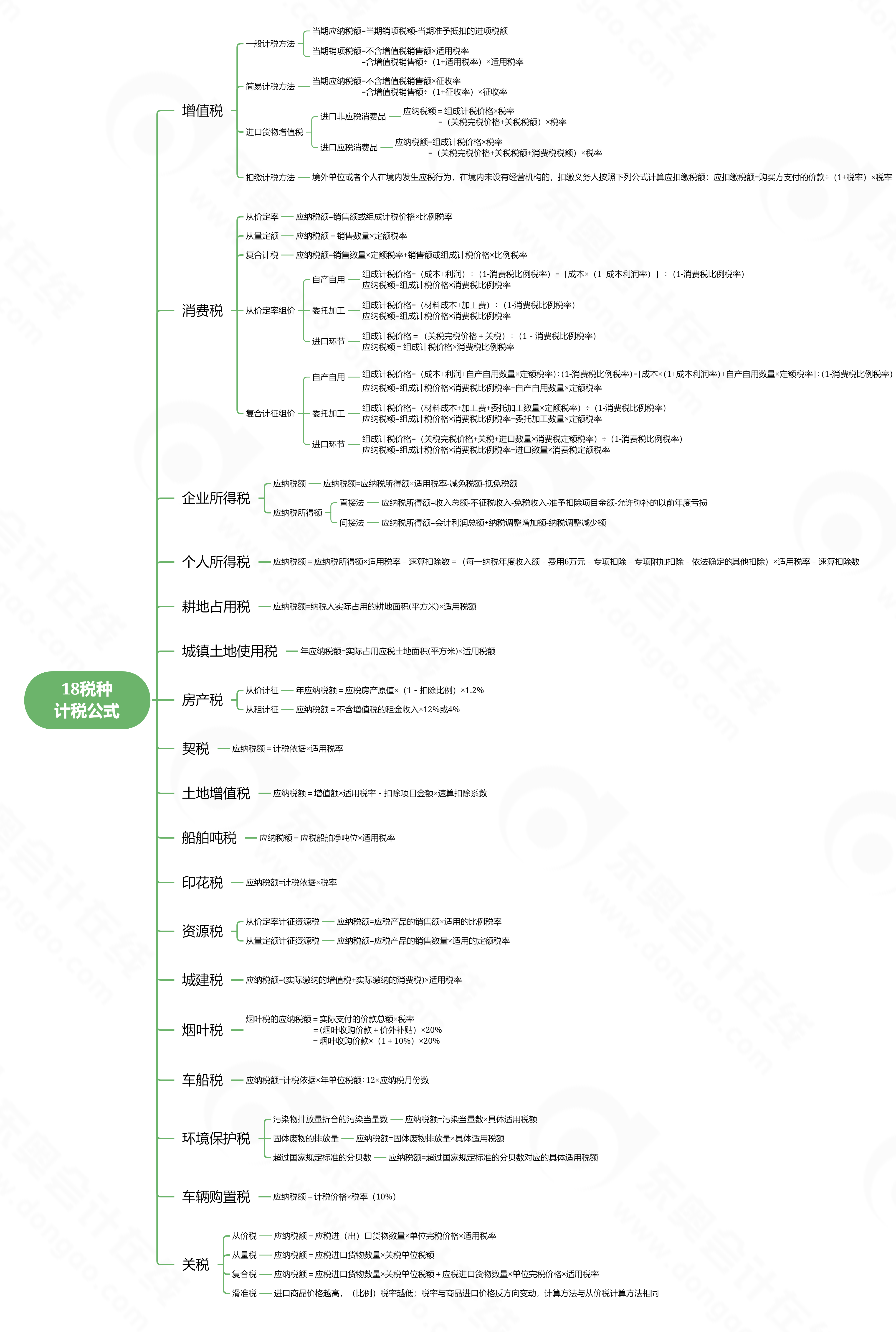 距離初級會計考試越來越近,為幫助考生提升備考效率,東奧會計在線特將《經(jīng)濟法基礎(chǔ)》中涉及的18稅種計稅公式整理成思維導圖,方便考生查看學習。