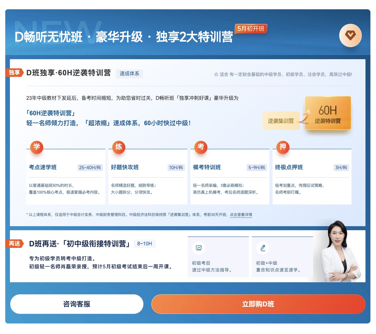 如果考生前期沒有復習中級的話,備考時間還是比較緊張的,考生需要一套高效的備考方法。建議大家報班跟著老師一起學?,F(xiàn)在購課有優(yōu)惠,購中級D班,買24送23!中級D班課程涵蓋今年、明年、后年3年的課,今年、明年都能考,后年還有1年兜底保障,還會送6本《輕松過關?》圖書,3年之內隨心選(可以選今年的現(xiàn)貨提前學,也可以等未來的預售圖書),另外,再送[初中級銜接特訓營],初級輕一名師肖磊榮老師親授,專為初級學員轉考中級打造,趕緊去沖>>