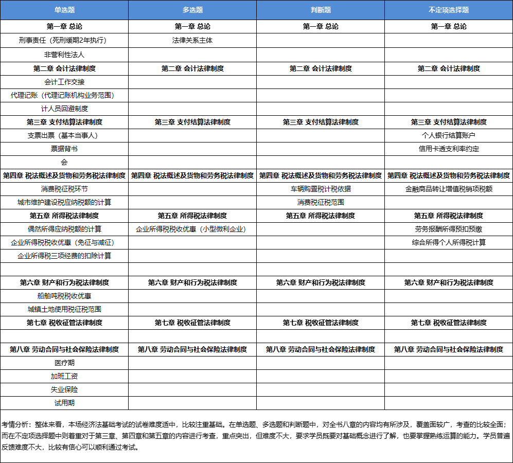 整體來看,本場考試中經(jīng)濟(jì)法基礎(chǔ)的難度不大,依然是秉持“重點(diǎn)恒重”原則,對于第四章和第五章的考查仍然是整套試卷中的重點(diǎn),在單選、多選和判斷題上呈現(xiàn)“遍地開花”的特點(diǎn),對全書八章的內(nèi)容均有考查,且內(nèi)容均比較基礎(chǔ),不涉及“偏難怪”的題目,比較常規(guī)。不定項(xiàng)選擇題則是集中對于第三章、第四章和第五章的知識點(diǎn)進(jìn)行了考查,且考查內(nèi)容均屬于課程和圖書中老師強(qiáng)調(diào)的重點(diǎn)內(nèi)容。