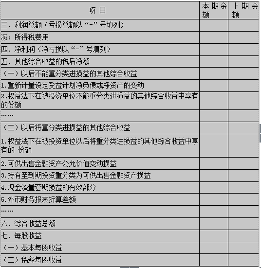 第三步,以利潤總額為基礎(chǔ),減去所得稅費(fèi)用,計(jì)算出凈利潤(或凈虧損)。 第四步,以凈利潤(或虧損)為基礎(chǔ),計(jì)算每股收益。 第五步,以凈利潤(或虧損)和其他綜合收益為基礎(chǔ),計(jì)算綜合收益總額。 我國企業(yè)利潤表格式如下表所示。