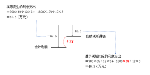 【解析】(1)向金融企業(yè)借款的利息支出,準(zhǔn)予據(jù)實(shí)扣除,可扣除金額=900×6%÷12×3;(2)向非金融企業(yè)乙公司借款的利息支出,不超過金融企業(yè)同期同類貸款利率計(jì)算的數(shù)額的部分,準(zhǔn)予在稅前扣除,可扣除金額=1800×6%÷12×3;(3)如果采用間接法計(jì)算應(yīng)納稅所得額,應(yīng)納稅調(diào)增27萬(wàn)元[參考下圖]。