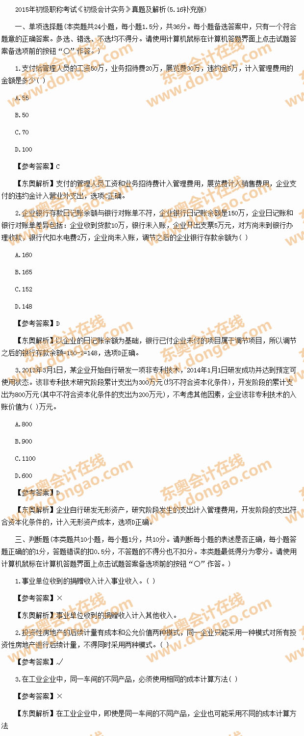 【東奧小編】2015年初級會計職稱考試已經(jīng)結(jié)束,大家最關(guān)心的是今年2015初級會計師真題及考試答案,非常多的網(wǎng)友在東奧考后討論區(qū)和2015初級會計職稱考試真題回憶區(qū)進(jìn)行考后交流,氣氛非;鸨,請大家進(jìn)入論壇進(jìn)行交流>>2015年初級會計職稱考試真題及解析(網(wǎng)友回憶版)。本篇為2015年《初級會計實務(wù)》考試真題及答案(5.16補充版)。
