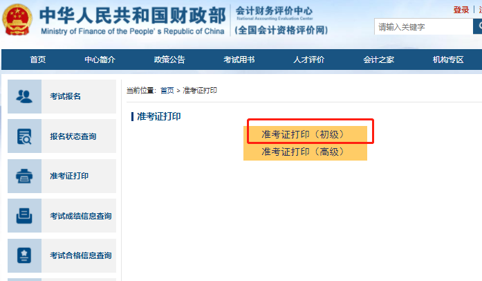 第一步:打開“全國會計資格評價網”,并點擊頁面左側的“準考證打印”按鈕。