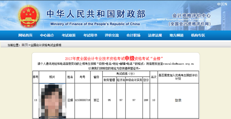 2017年,她以全國第10名的優(yōu)異成績一年內(nèi)通過中級會計職稱考試。