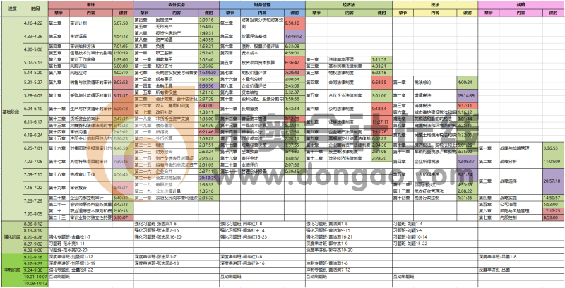 汪娟制作的這張備考計劃表上,寫滿了學(xué)習(xí)計劃,學(xué)習(xí)任務(wù)按日期分布,細(xì)化到對應(yīng)章節(jié)的學(xué)習(xí)課時長度。因為她要同時備考注會6科,所以采取《審計》、《會計》、《財務(wù)》先備考的方式,同時這三科也是較度較高的科目,所以占用了大部分的備考時間?!督?jīng)濟法》、《稅法》、《戰(zhàn)略》復(fù)習(xí)時間依次遞減。