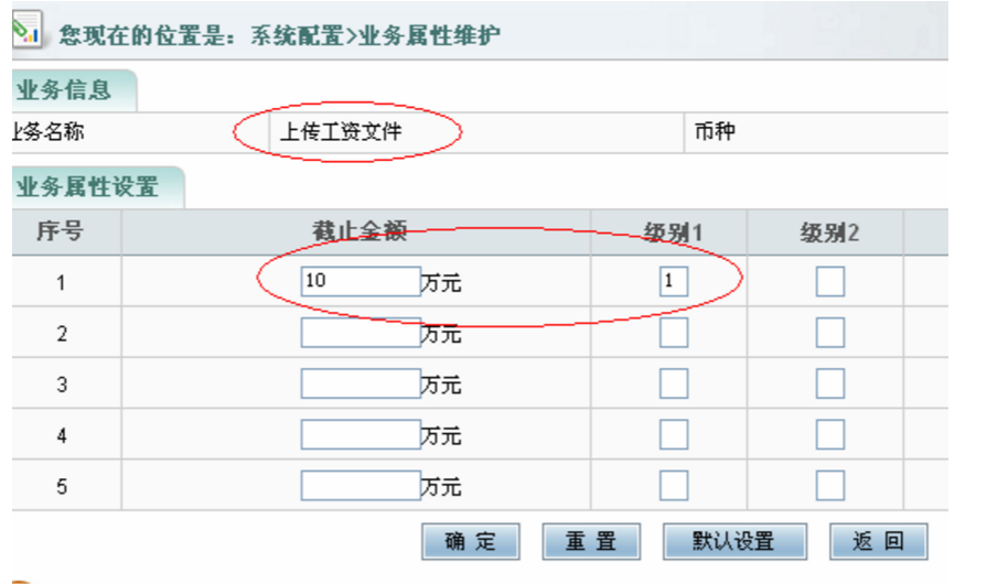 選擇“系統(tǒng)配置”―“業(yè)務(wù)屬性維護”菜單中,選擇“上傳工資文件”,設(shè)置企業(yè)代發(fā)工資的截止金額和各級復(fù)核員的人數(shù)。