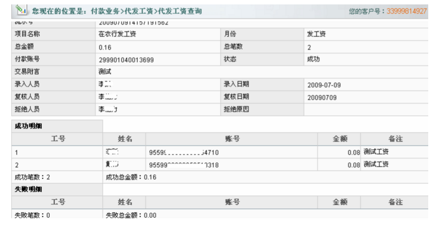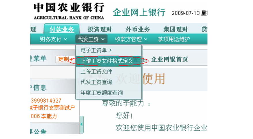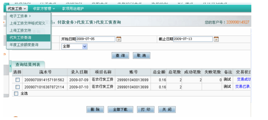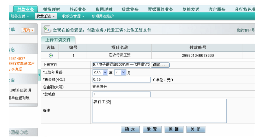 選擇“代發(fā)工資”下的“年度工資額度查詢”,假如金額=0,請和企業(yè)網(wǎng)銀