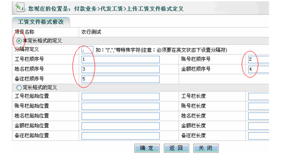第三步:工資文件格式定義(首次操作時要設(shè)置)。操作員選擇“付款業(yè)務(wù)”―“代發(fā)工資”―“上傳工資文件格式定義”菜單。