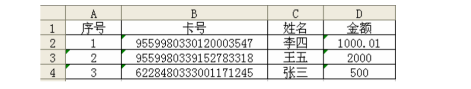 轉(zhuǎn)換工資文件。每個月發(fā)工資時,您需要先準備好包含“序號、卡號、戶名、金額”的EXCEL工資表